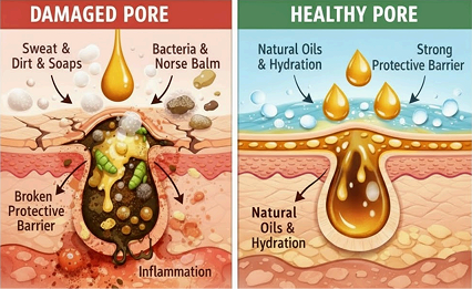 Most commercial-grade synthetics are loaded with cheap thickeners, silicones, and waxes (like Paraffin or Dimethicone) to make them feel "creamy." For an athlete, these are "Liquid Plastics." When your child starts to sweat, these fillers trap the heat and toxins inside the pore, causing congested skin and those stubborn "under-the-skin" bumps that never seem to go away. Norse is 100% "Non-Comedogenic." Our wild resins and oils have a molecular structure that stays "open" and breathable. It allows the skin to perform its natural cooling process (sweating) without trapping the very bacteria we’re trying to kill.