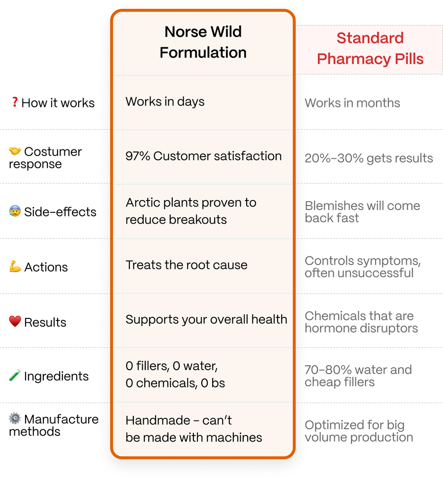 That is why Norse Organics exists. I didn't want to create just “another brand.” I wanted to create a safe place. We stripped away the cheap fillers, the water, and the synthetic toxins. We replaced them with pure, wild-harvested Arctic plants that are powerful enough to heal cystic acne but safe enough to eat.